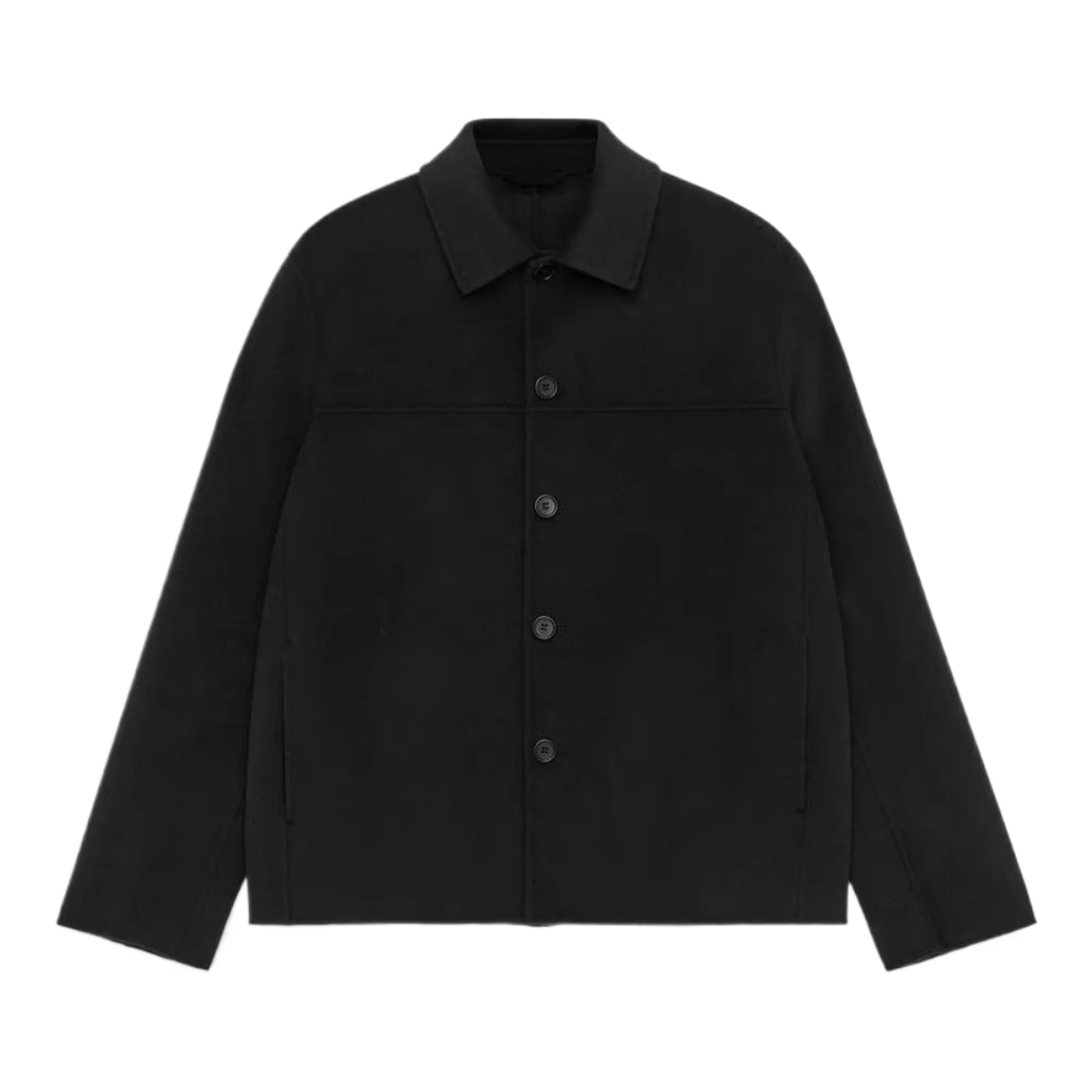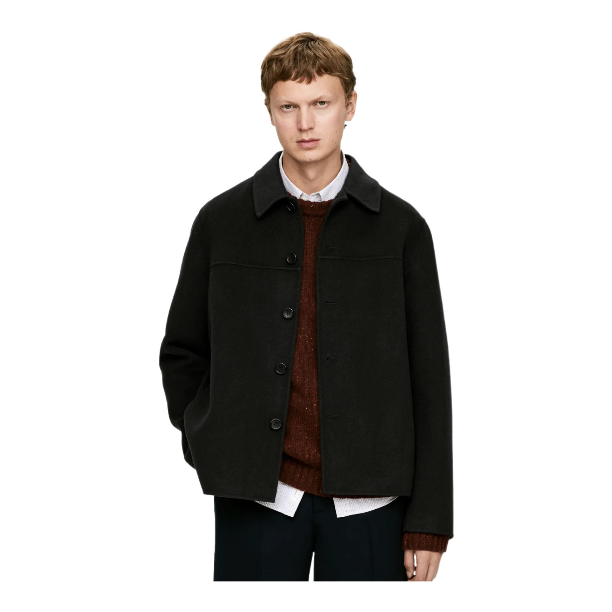 Short jacket made from a premium doublé wool fabric. Corozo button closure and pockets in side seams. Fully lined. Relaxed fit. The shell fabric contains 60% RWS wool (TE-00047206). Products certified to the Responsible Wool Standard (RWS) contain wool fiber from farms independently certified to animal welfare and land management requirements.