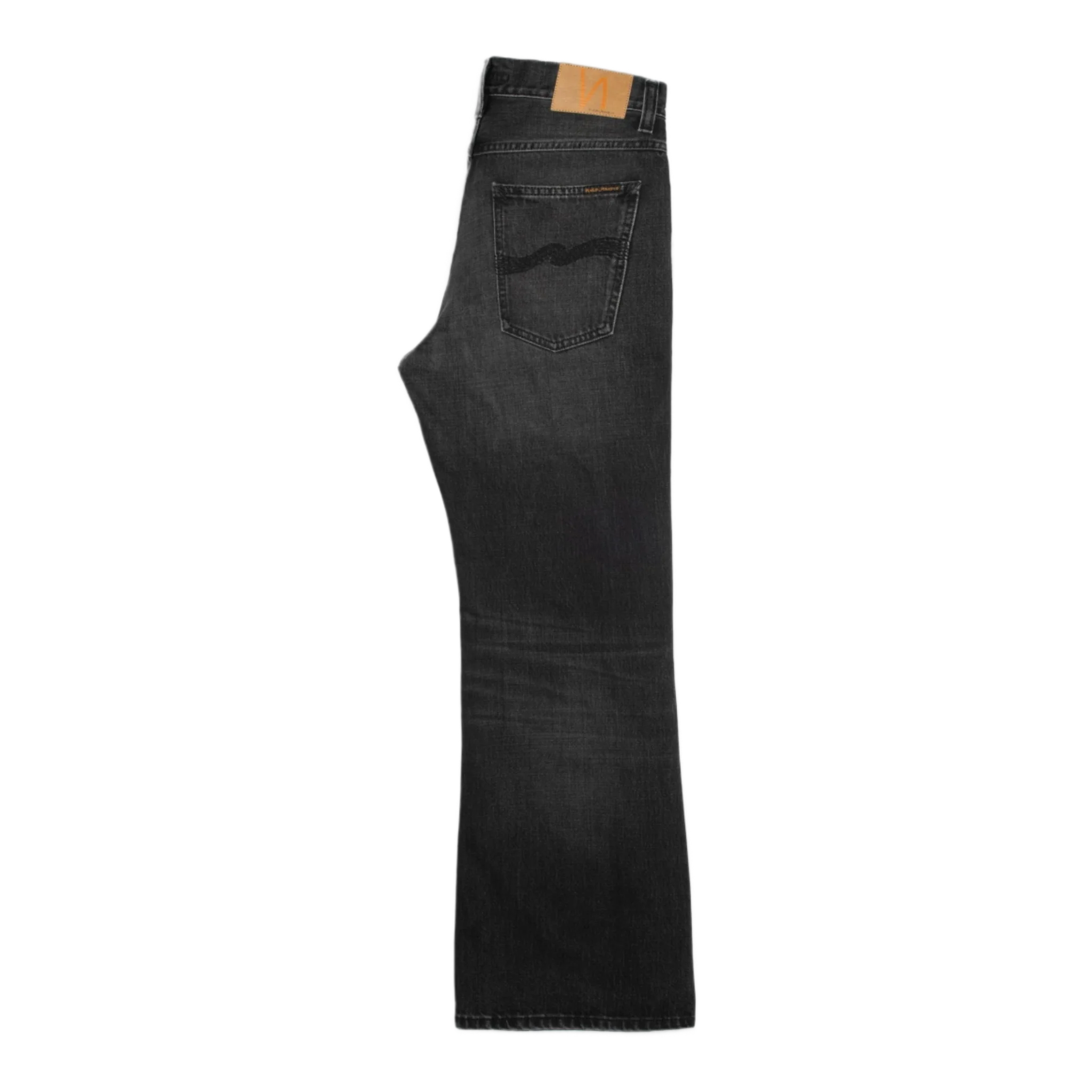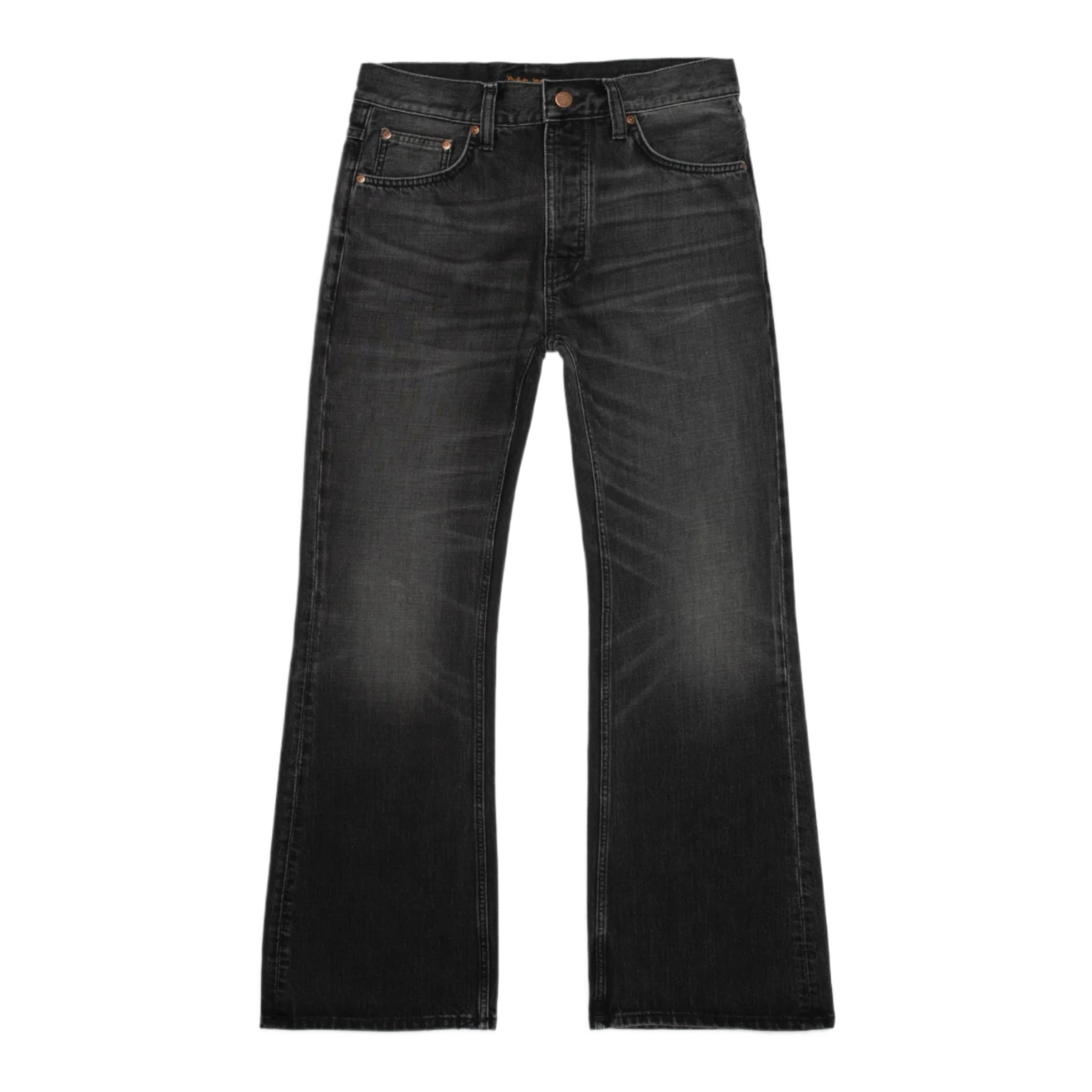 A mid waist regular-fit jean with a flared leg, featuring a deep, richly textured black wash. Crafted from exceptional black-overdyed-black denim with pronounced slubbiness, the fabric reveals a striking salt-and-pepper grain and a subtle crosshatch texture. While highlighting contrasts, the wash preserves deep pitch-black tones, creating a beautifully dynamic and dimensional finish.