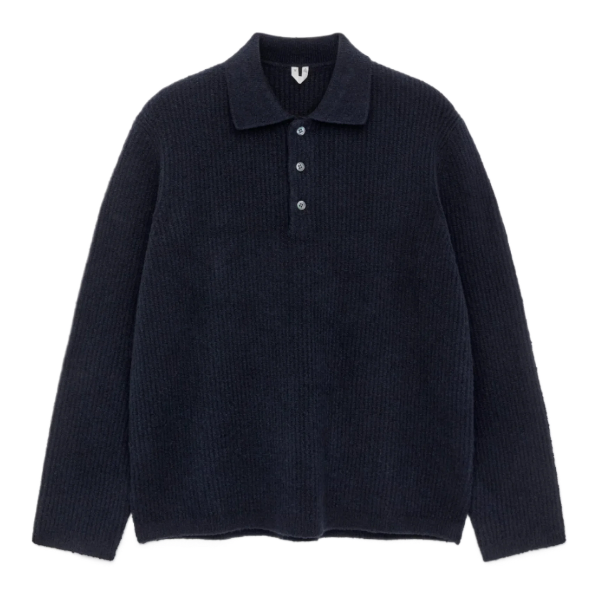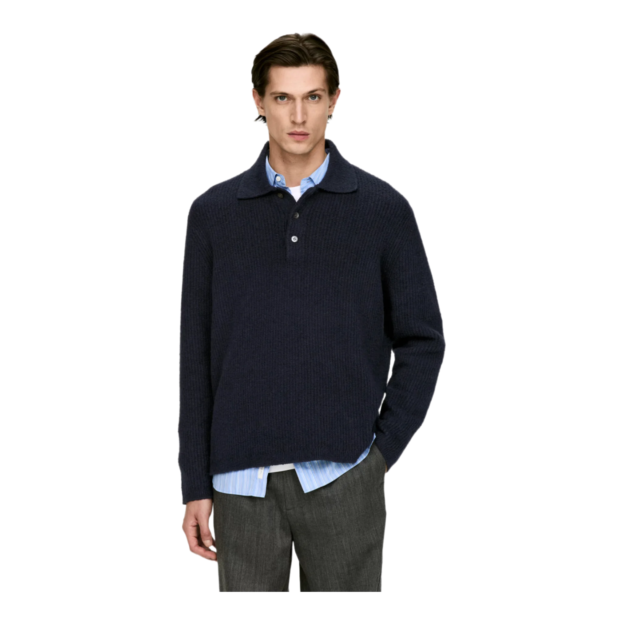 Knitted jumper featuring a neps texture. The jumper is knitted in a half-cardigan stitch from a cotton blend. A polo style with collar and a buttoned half-placket. Regular fit. The product contains 5% RWS wool (TE-00047206). Products certified to the Responsible Wool Standard (RWS) contain wool fiber from farms independently certified to animal welfare and land management requirements.