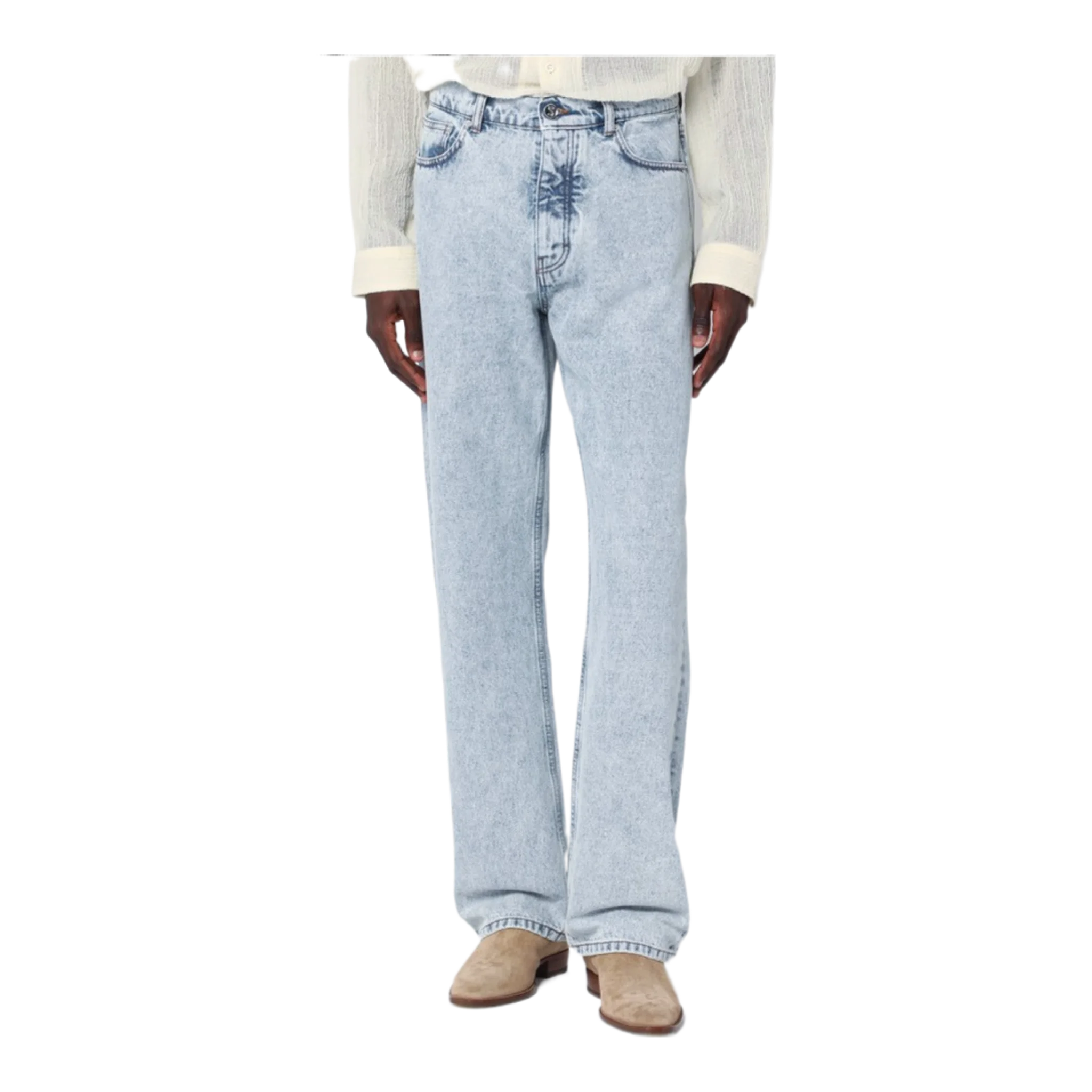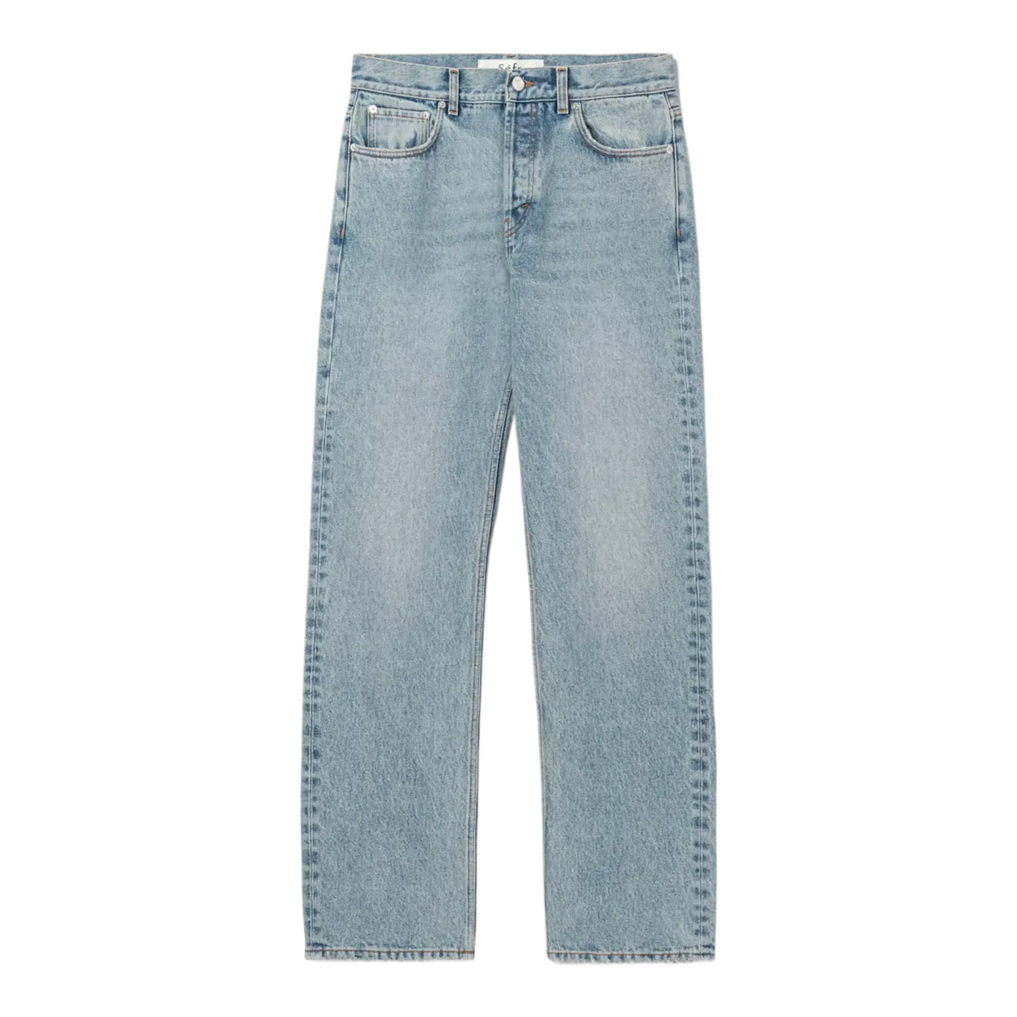 Regular jeans by Séfr in light blue cotton denim, featuring a front zip and button closure, belt loops, five classic pockets, and a back logo patch.