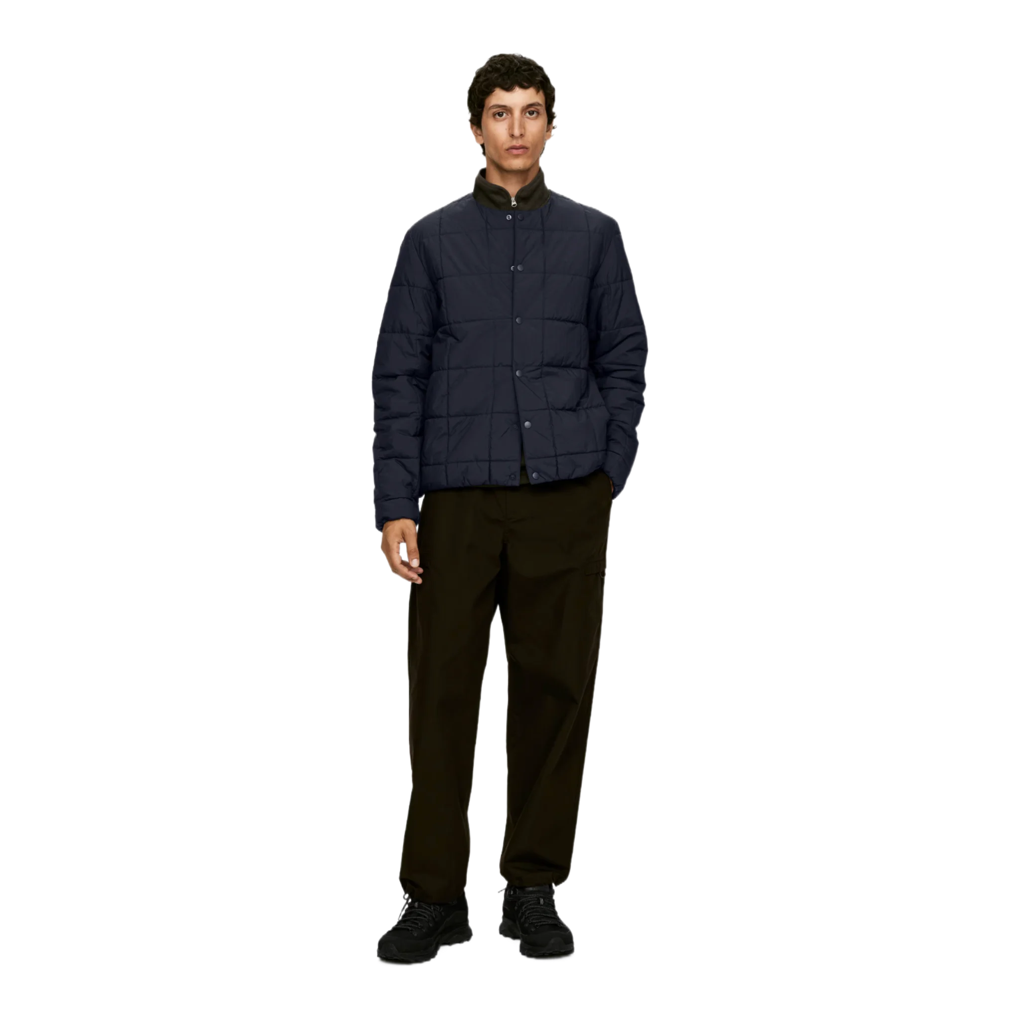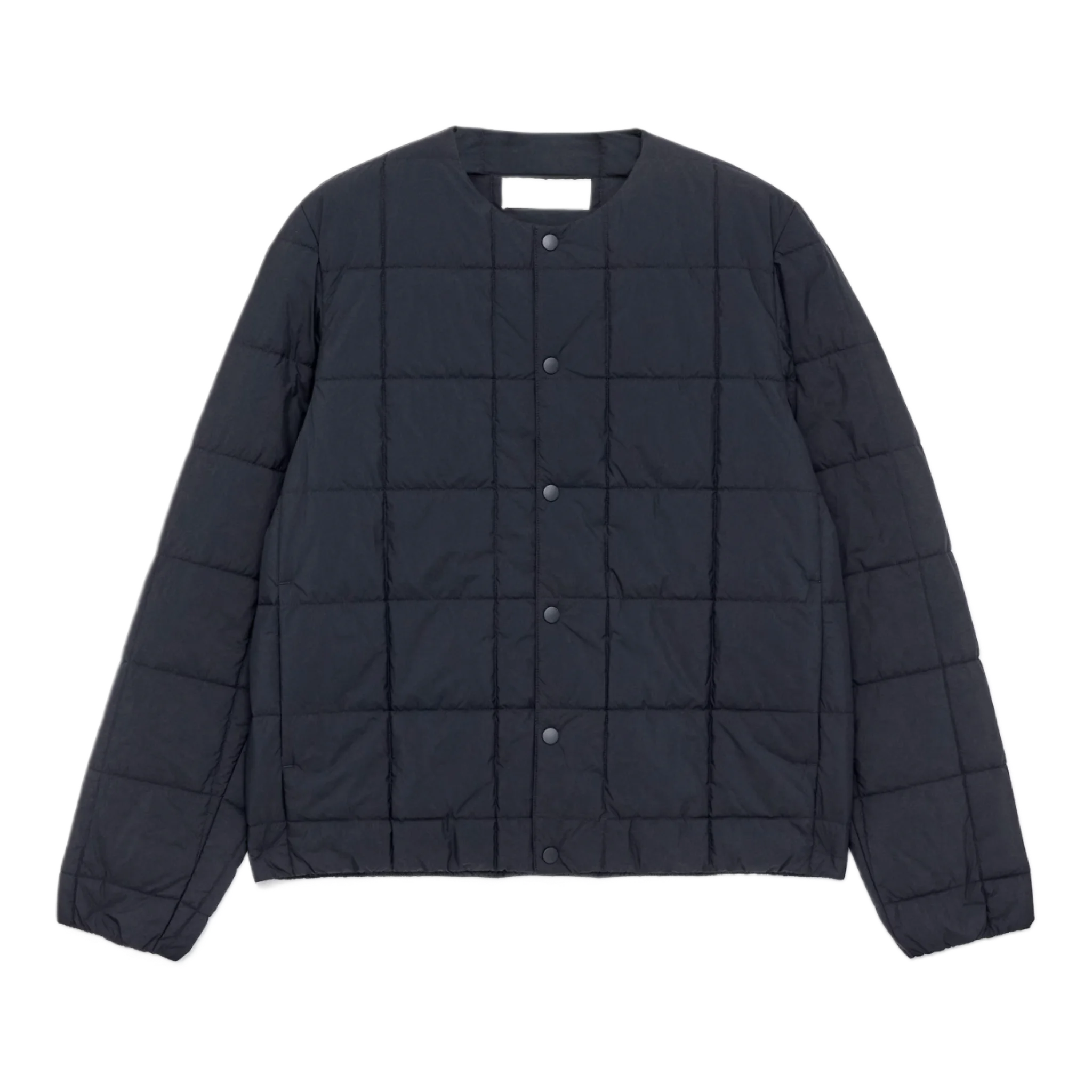Light-padded jacket featuring a checked quilt pattern. A versatile piece that can be used as a layering piece or as a transitional jacket. A collarless style with snap button closure at front, side pockets and elastics at bottom hem. Inner patch pocket.