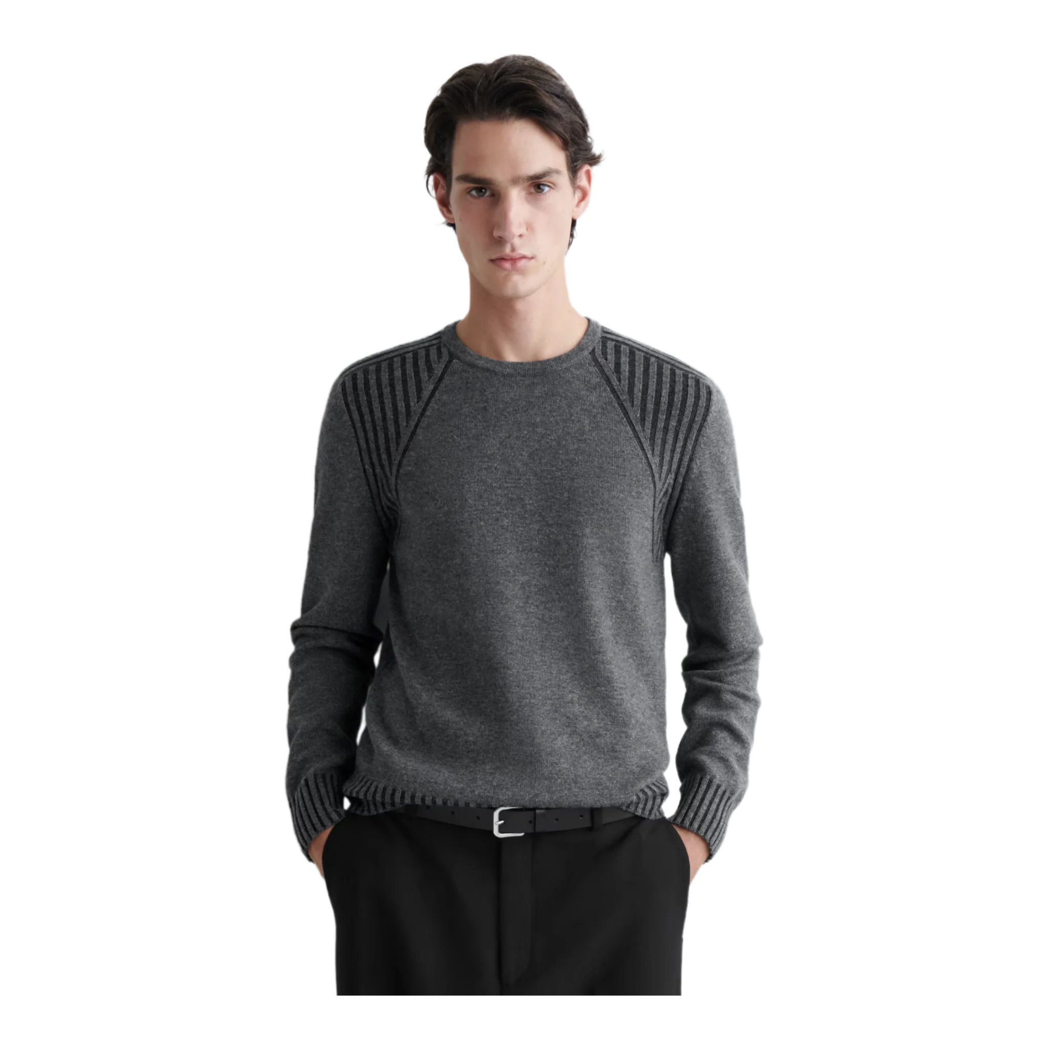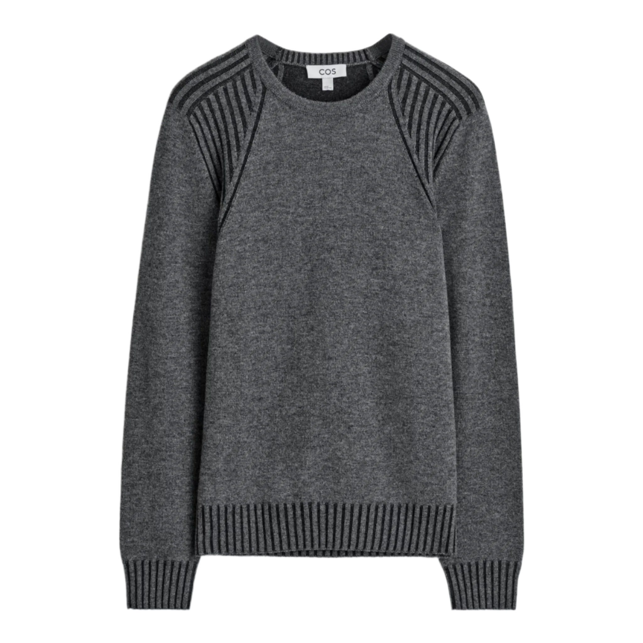 The COS menswear collection proposes a wardrobe of modern signatures. This crew-neck jumper is knitted from premium merino with hints of cashmere for a luxuriously soft hand feel. It's cut in a streamlined, slim shape and designed with coated ribbed panels at the shoulders for a contemporary look.
