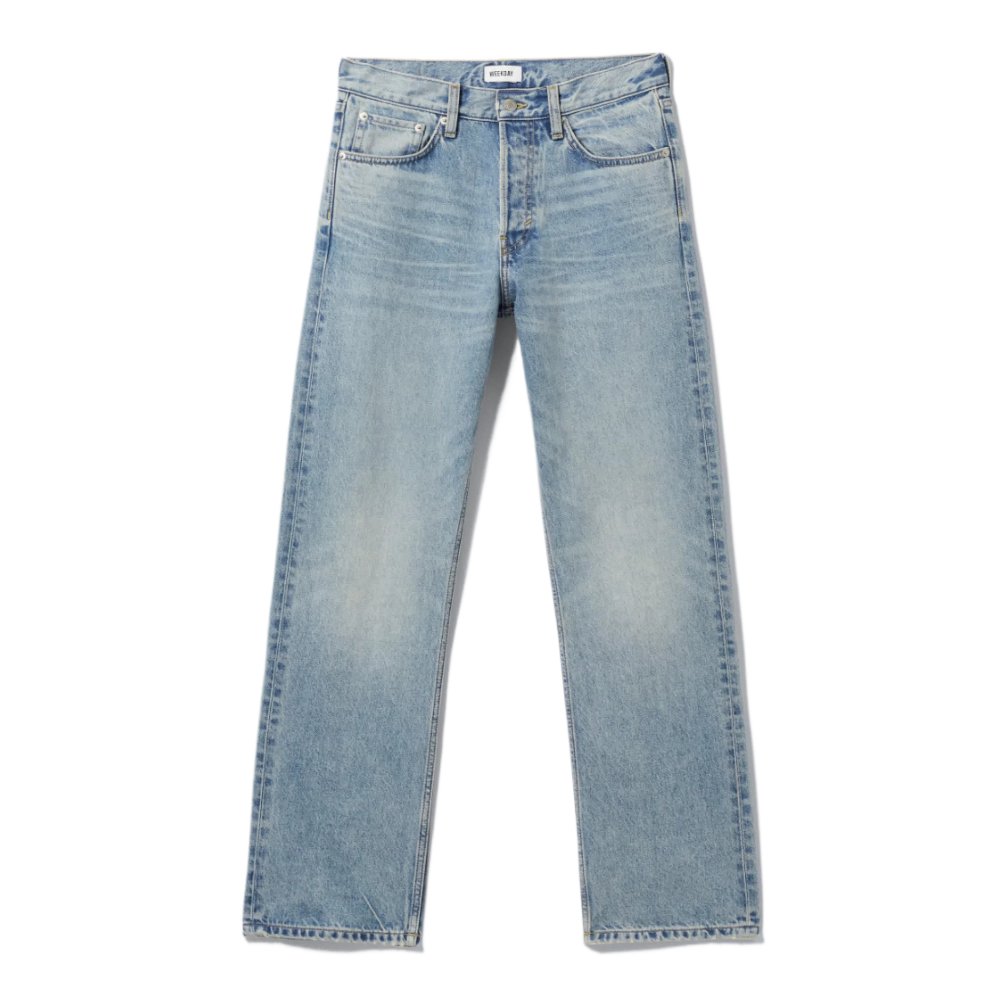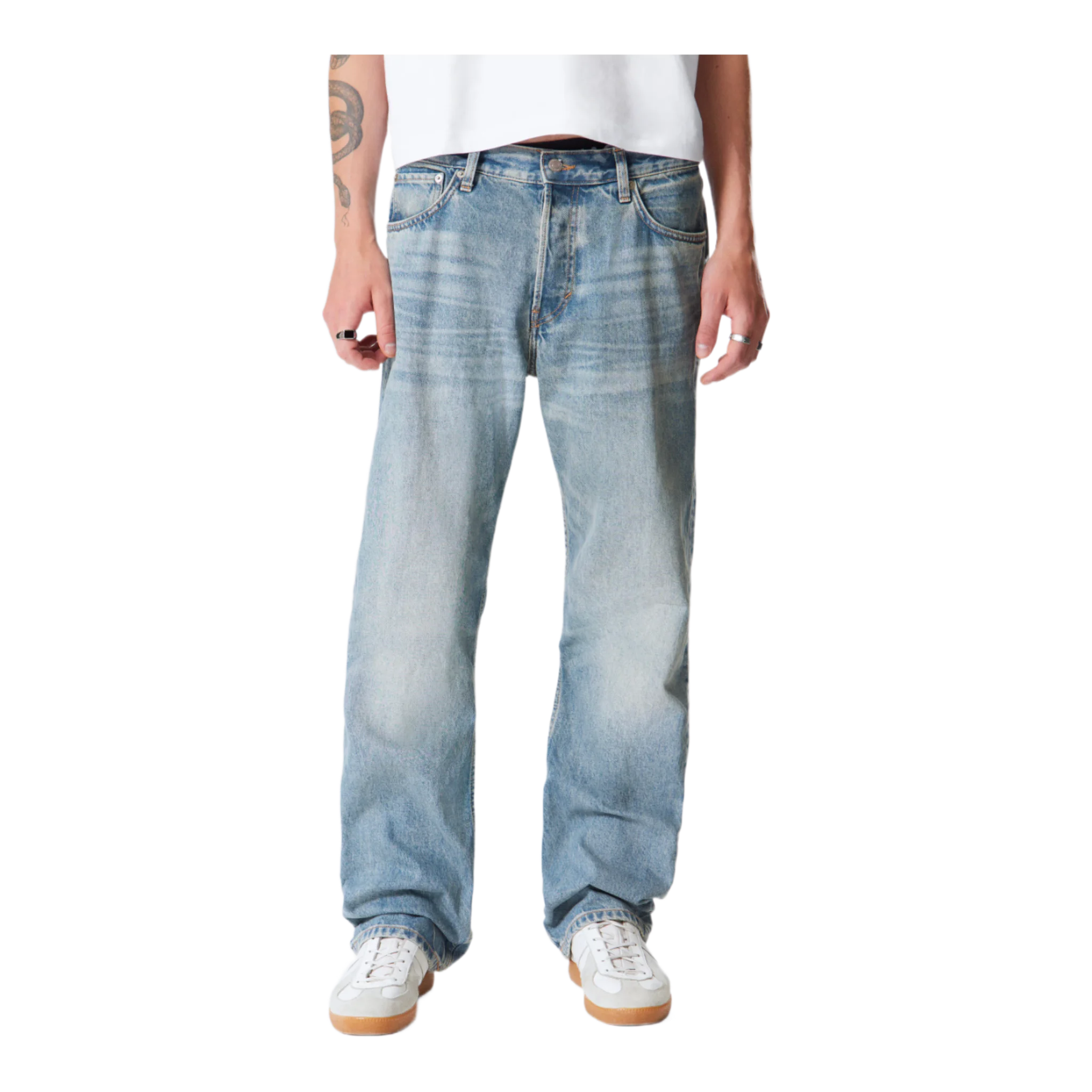 A pair of mid rise unisex jeans with a regular fit, straight leg and long length. These jeans are crafted from organic cotton rigid denim enhanced with recycled cotton. They feature a classic 5-pocket design and a button fly.