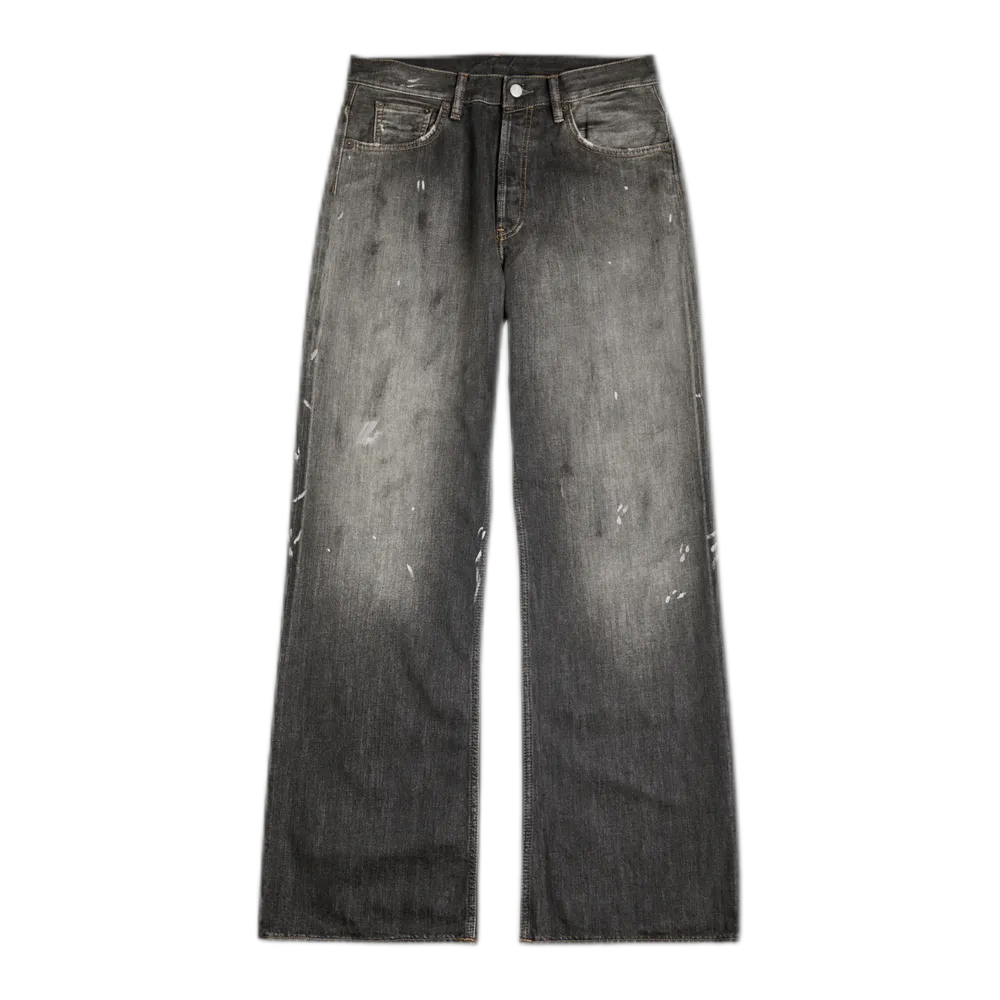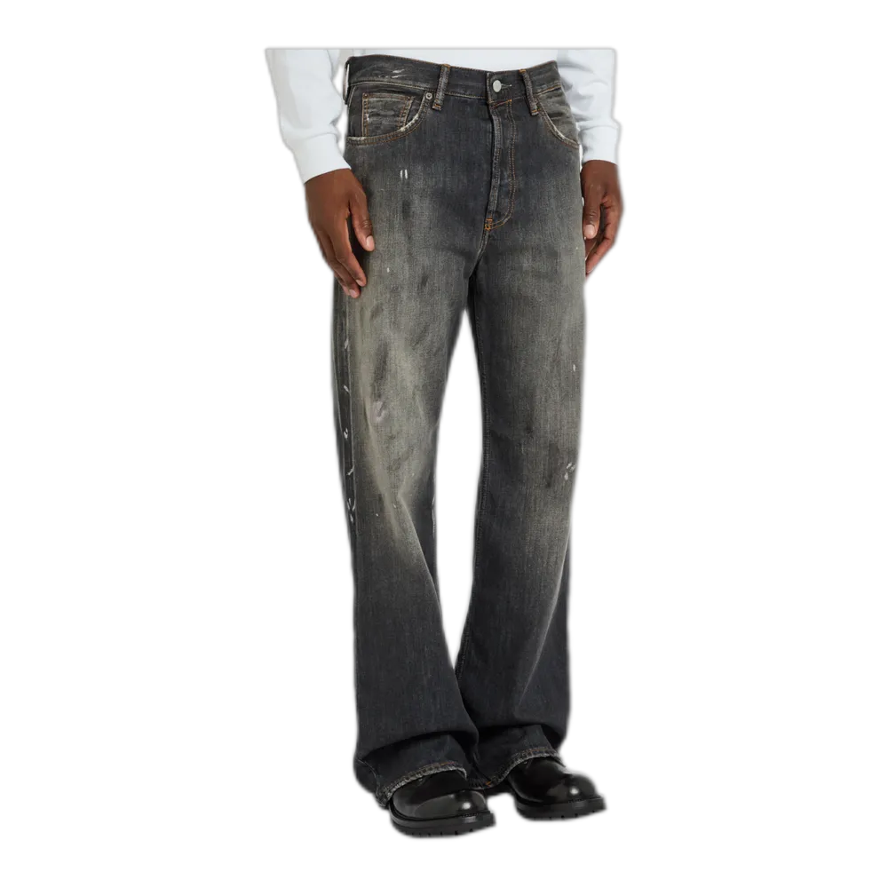 - Mid-rise fit, straight-leg cut, belt loops, five pockets, designer plaque at back, paint-splatter effect, distressed details, designer-engraved hardware, faded finish