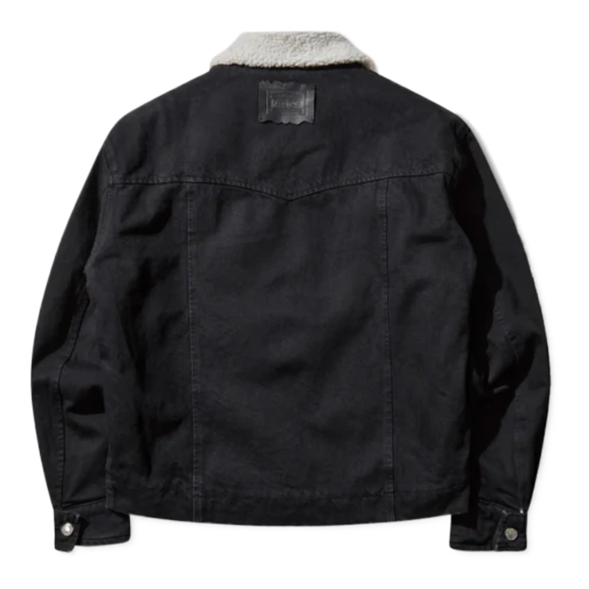Unisex denim car coat with a faux shearling sherpa lining and woven leather patch on the back.