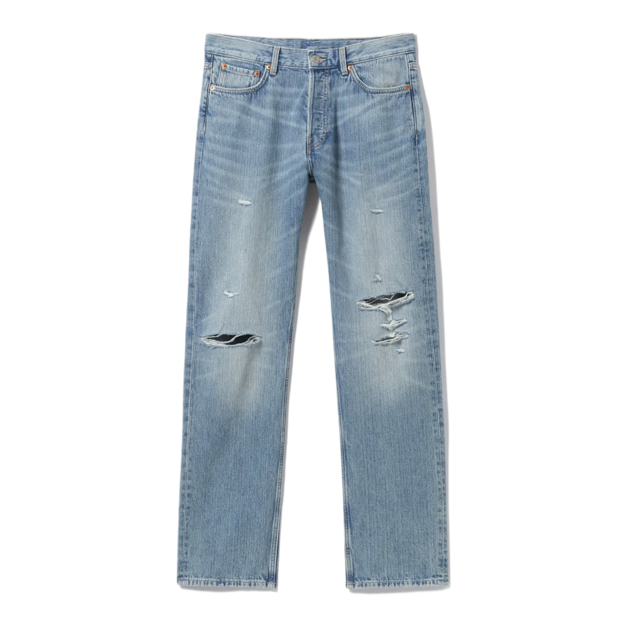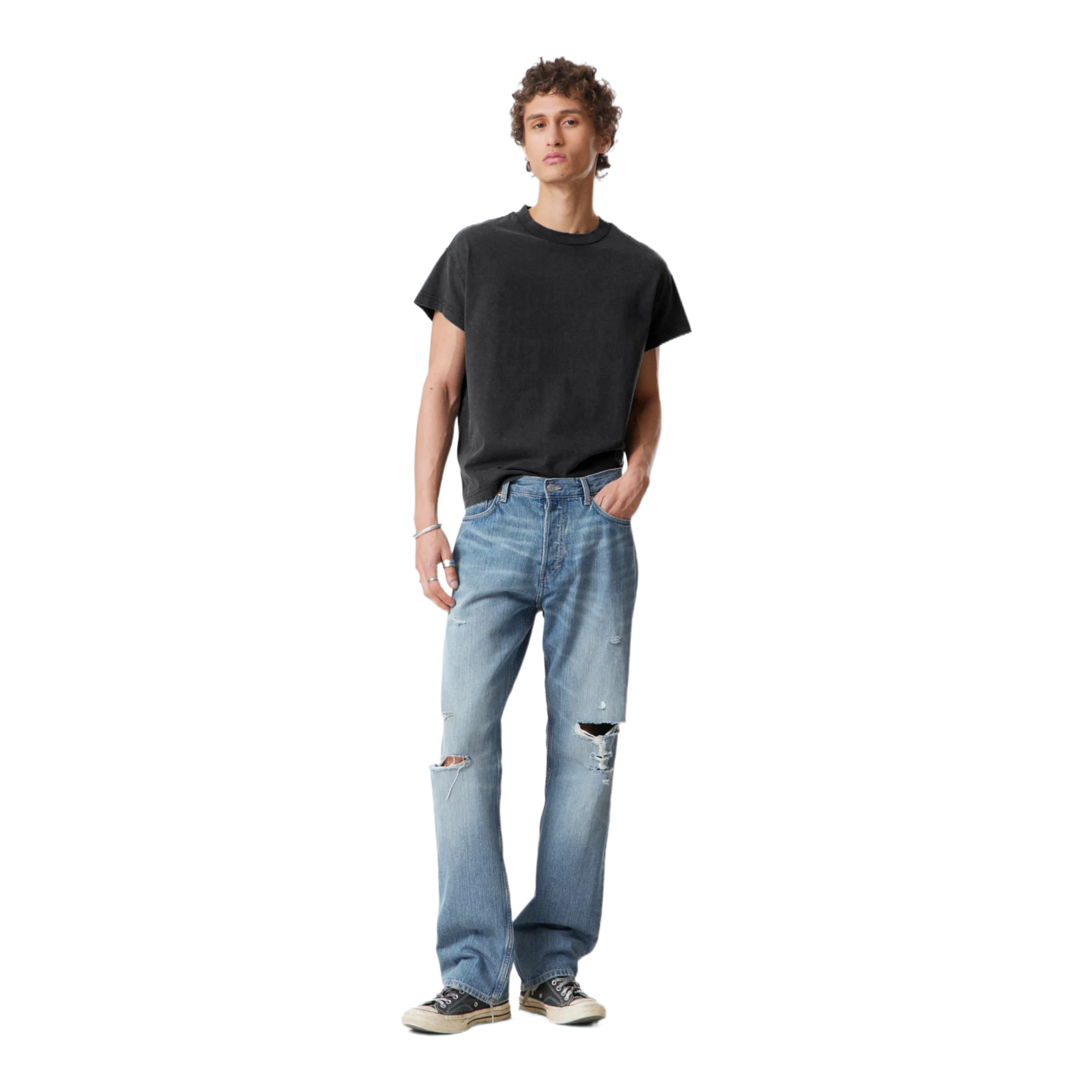 A pair of relaxed fit, distressed jeans with a straight leg and long length. These jeans are crafted from organic cotton denim enhanced with recycled cotton. They feature a classic five-pocket design, and a button fly.