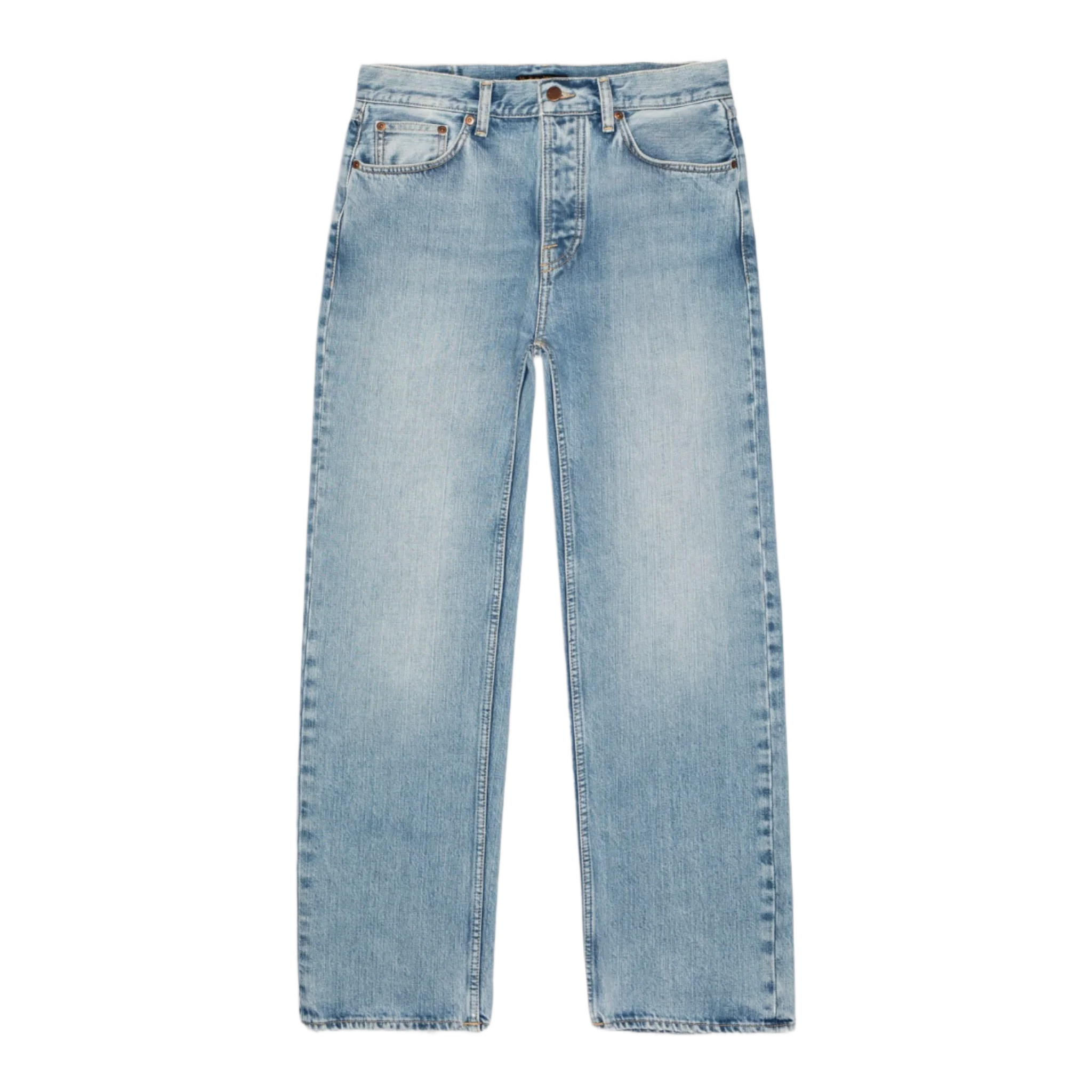 Wide-legged loose-fit jeans in a beautifully vintage-inspired wash. Crafted from streaky denim, they display a striking texture with pronounced vertical slubs of varying length and thickness.