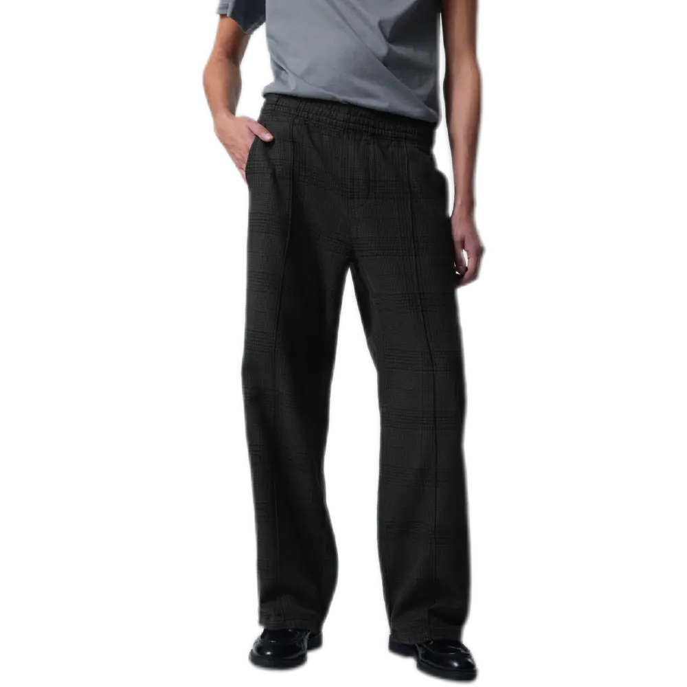 Featuring an elastic waistband with an adjustable drawstring, these trousers provide a customized, comfortable fit. The slanted side pockets and back welt pockets add both function and a sleek aesthetic, while the sewn-in press-studs at the front and back enhance the structured silhouette.